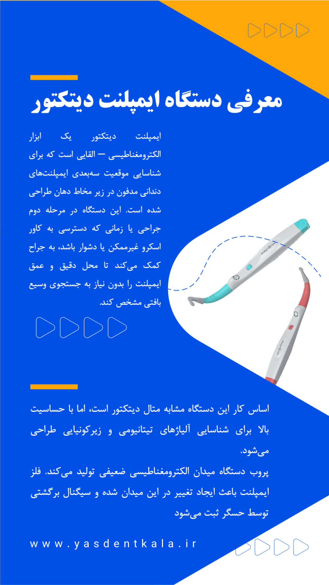 ایمپلنت دیتکتور Easyinsmile یک ابزار دقیق و هوشمند برای شناسایی موقعیت ایمپلنتهای مدفون زیر بافت لثه و استخوان در جراحی های Fresh Socket است. این دستگاه با استفاده از حسگر الکترومغناطیسی با حساسیت بالا، امکان تعیین موقعیت دقیق ایمپلنت را بدون نیاز به رادیوگرافی یا برش بافتی فراهم میسازد.