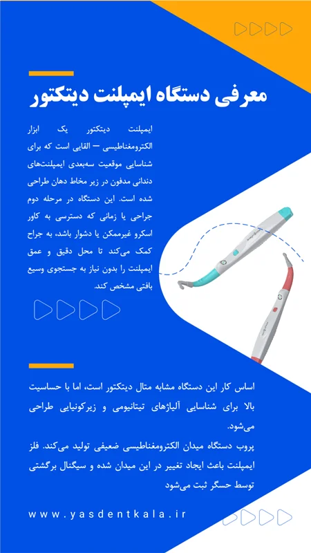 در جراحیهای دو مرحلهای ایمپلنت، پیدا کردن موقعیت دقیق فیکسچر میتواند چالشبرانگیز باشد؛ ایمپلنت دیتکتور Easyinsmile با دقت میلیمتری خود، این مشکل را برطرف کرده و موجب کاهش زمان جراحی، کاهش تروما به بافت نرم و افزایش دقت کلینیکی میشود.