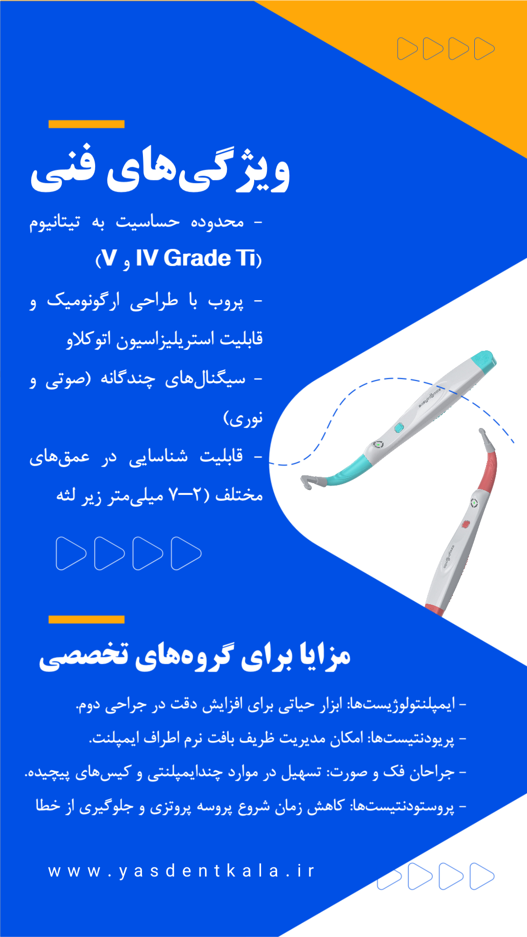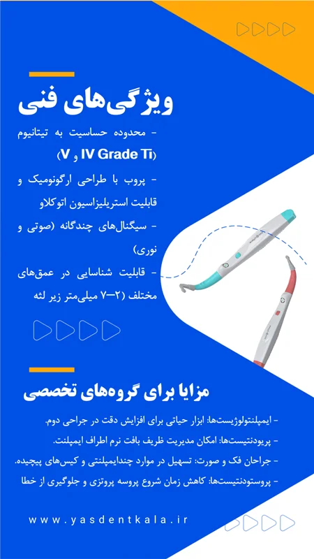 - دقت بالا در شناسایی موقعیت ایمپلنت تا عمق ۵ میلیمتر زیر بافت لثه یا استخوان