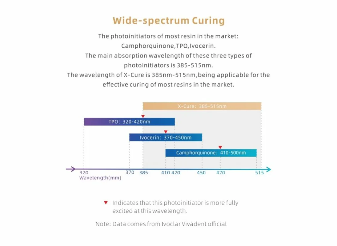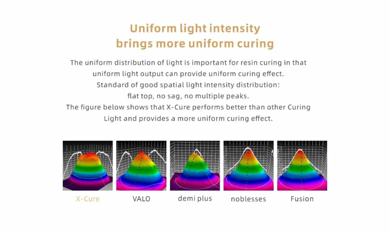 از ویژگیهای لایت کیور X-Cure میتوان به مدهای متنوع کاری، امکان تنظیم زمان کیور، شدت نور ثابت (باعث استحکام بیشتر بخش کیور میشود)، باتری قدرتمند و حالت چک برای تشخیص پوسیدگی دندان و دندان ترک خورده اشاره کرد.